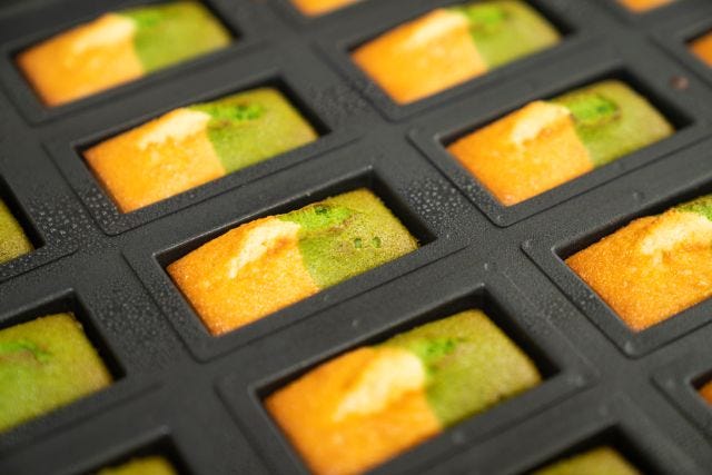 「京フランス」(1個/220円) 屋外のテイクアウトカウンターでは、「京マドレーヌ」や抹茶&バターのフィナンシェ「京フランス」を焼きたてで販売。また、抹茶チョコレートやミルクチョコレートをかけていただくソフトクリームは、写真映えもしそう。