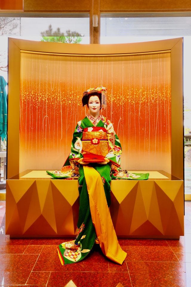 舞妓ロボット「茶ト加」 店内には、舞妓ロボット「茶ト加(ちゃとか)」による抹茶でのおもてなしというユニークな演出も。京ことばで語りかける「茶ト加」と一緒に、写真を撮るのもOK。ステージの背景は、華やかな和紙や季節の植物が彩ります。
