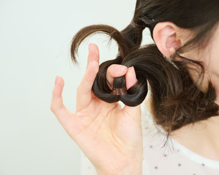 結び目の下にゴムを結び、丸みが出るようひっぱり出す。その下にゴムを結んだら、くるりんぱをしてキツく締める。もう一方の毛束は順番を逆にして結ぶ。