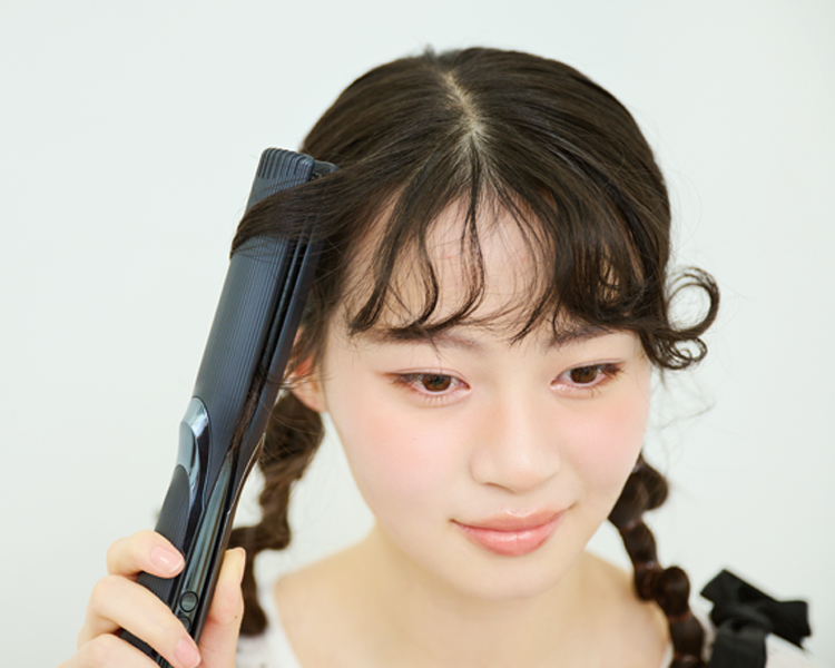 ストレートアイロンをタテに入れ、外巻きになるようおくれ毛を挟む。髪を挟んだまま、アイロンを後ろにスライドさせてカールをつくる。前髪も同じ要領でカールにしていく。