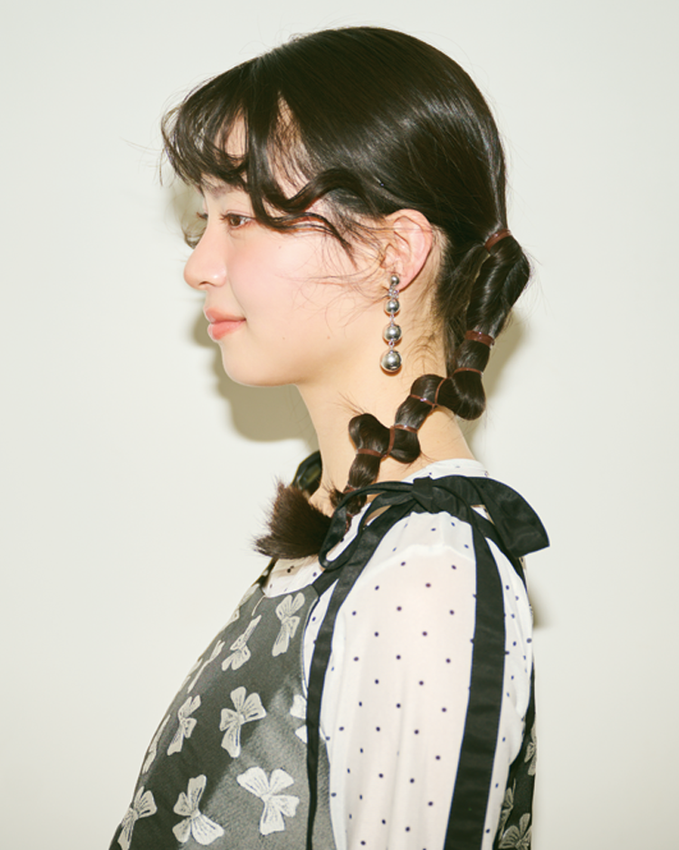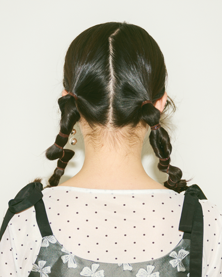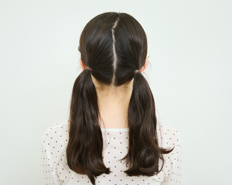 全体の髪を真んなかで分けたら、正面からも少し見える耳の横でそれぞれ結んでツインテールをつくる。結ぶ高さは同じに。