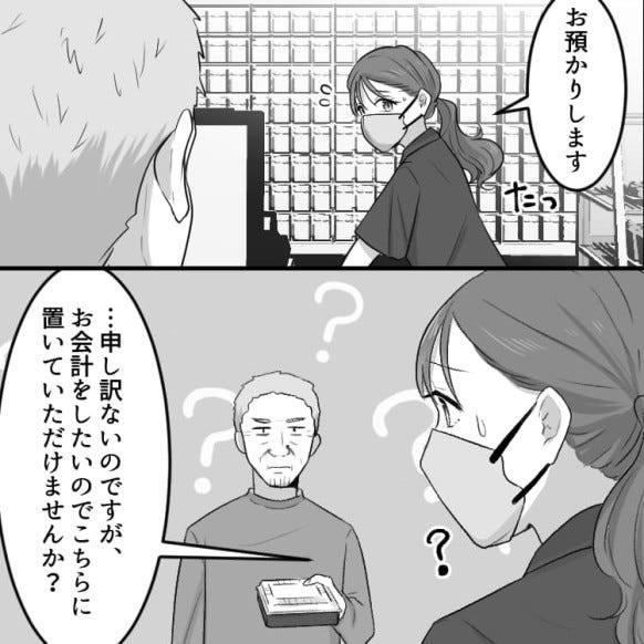 レジが汚いからとお客さんに商品をレジに置いてもらえず、お会計ができない奈央。