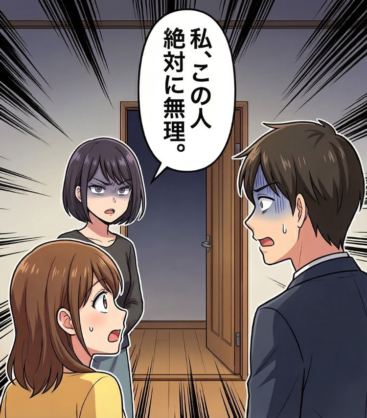 妹は彼をひと目見るなり、あからさまに嫌悪感をむき出しに。挨拶もそこそこに、「私、この人絶対に無理」と冷たい声で言い放ち、そのまま自分の部屋へ閉じこもってしまったのです。