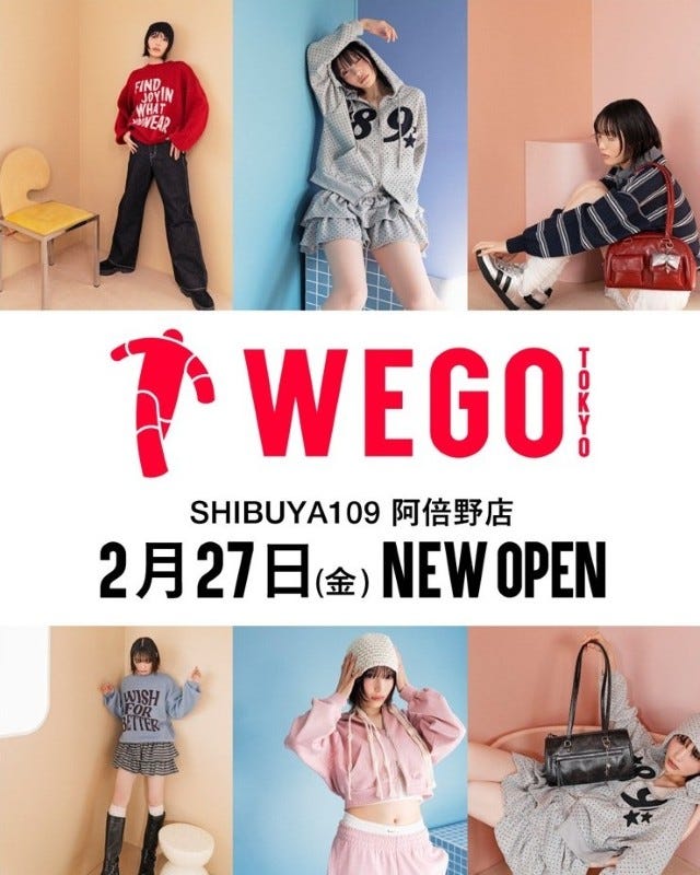 WEGO TOKYO/2026年2月27日(金)ニューオープン/ユニセックスファッション Z世代やα世代を中心とした多様なニーズに対応する幅広いテイストのファッションに加え、推し活などのライフスタイル雑貨も取りそろえています。世界中のトレンドが集まる“TOKYO”の最新に触れるだけでなく、自分ならではのファッションスタイルが実現できそうです!