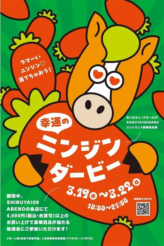 館内各店舗にて、1会計税込4,000円以上を購入すると、ニンジンくじを用いた春の大抽選会に参加可能。出た賞に応じて「SHIBUYA109阿倍野店限定お買物券」や豪華景品がもらえます。