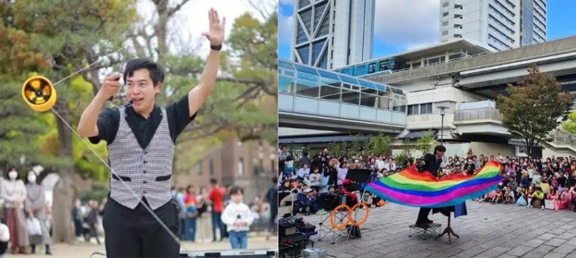 左:ジャグラーのみぞんさん、右:EntertainerのMIKIYAさん 会場では、大道芸人によるパフォーマンスを無料で見ることができます。