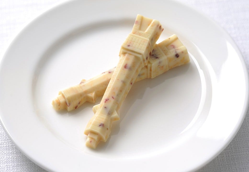 「通天閣クリスピーショコラ」 サクサクのシリアルにこだわりのホワイトチョコレートをコーティングした定番「通天閣クリスピーショコラ」。クランベリーを混ぜ込み、甘さと酸味のバランスが絶妙です。