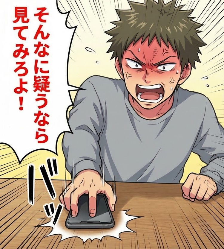 しまいには「そんなに疑うなら見てみろよ!」と、自分のスマホを勢いよくテーブルに叩きつけたのです。