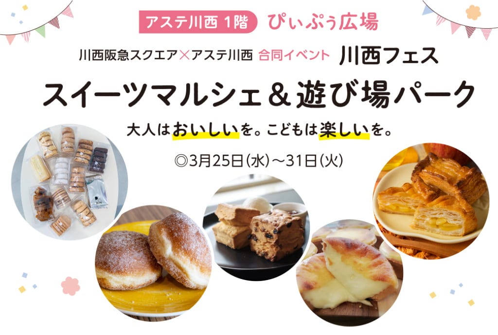 2026年3月25日(水)~3月31日(火)の期間中、「アステ川西」で「スイーツマルシェ&遊び場パーク」が開催。地元で親しまれるカフェやパティスリーのスイーツと、親子で楽しめるワークショップが展開されます。