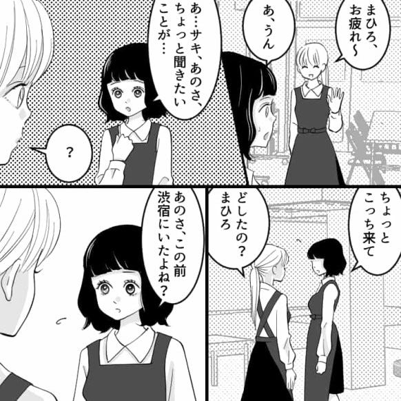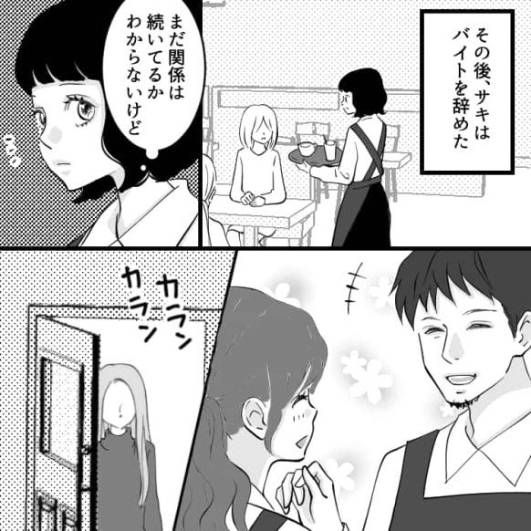 ある日主人公が街に買い物へ出かけると、彼女持ちの店長とサキが腕を組んで歩いているところを目撃してしまいます。
