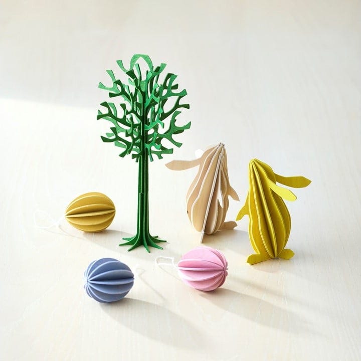 (右)「ロヴィ」の「ラビット」(高さ約9cm/各2,200円)、(左下)「エッグ(3色ミックス)」(約4.5cm/6個入り/3,960円)、(左上)「ツリー(フォレストグリーン)」(高さ約16.5cm/2,640円)