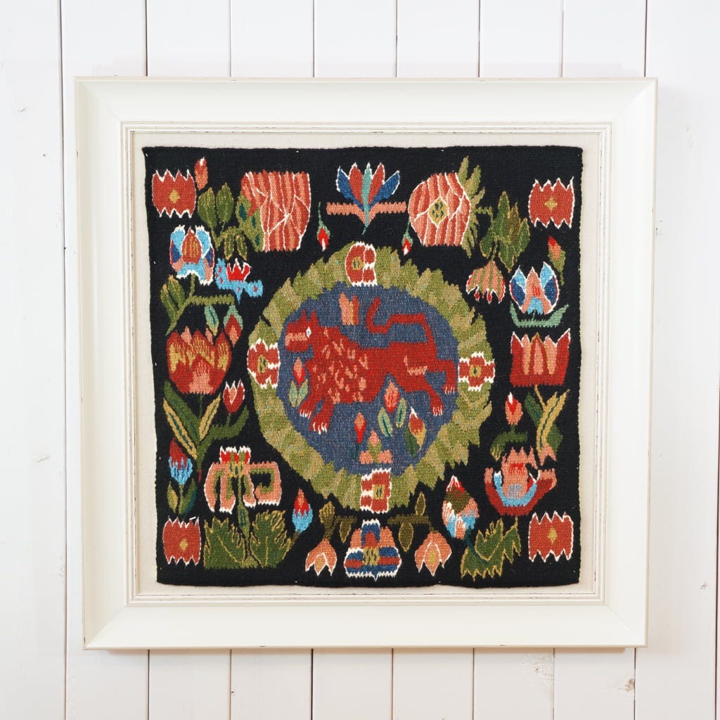 「ライオンと花(フレミッシュ織りの壁掛け)」(額入/112,200円)※現品限り そのほか、北欧のヴィンテージ品もお目見え。食器やブローチといった特別な日に使いたくなるアイテムが用意されます。すべて現品限りなので、お早めに!