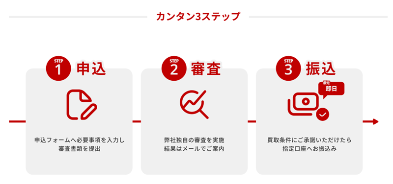 また、審査結果は電話ではなくメールで分かりやすく案内されるため、日中の電話対応に追われる心配も少なく、スムーズに状況を把握できます。 買取条件に承諾したら、指定口座へスピーディーにお振込み 審査通過の案内メールにて、手数料や最終的な買取金額といった具体的な条件が提示されます。提示された条件内容に納得し、WEB上で買取条件に承諾すれば契約は完了となります。契約が完了次第、速やかにお客様ご指定の銀行口座へ買取代金がお振込みされます。