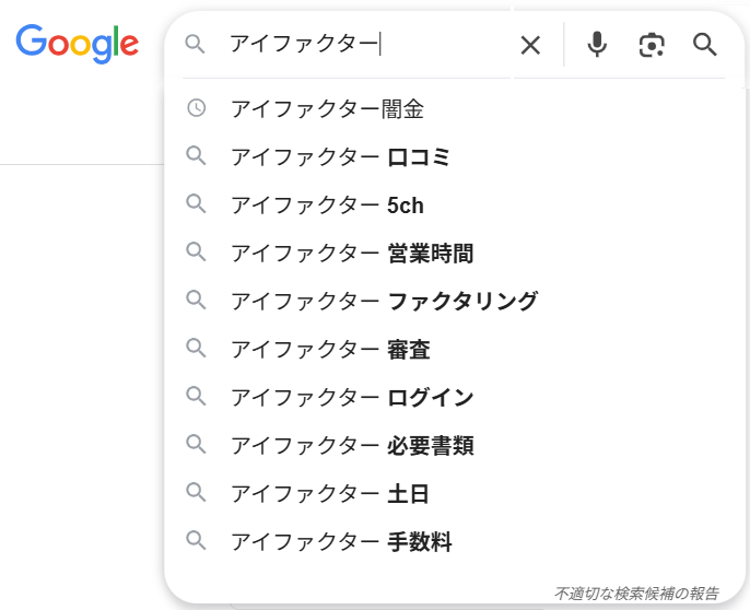 インターネット上で「アイファクター」と検索すると、「アイファクター 闇金」「アイファクター 口コミ」「アイファクター 5ch」「アイファクター 営業時間」「アイファクター ファクタリング」「アイファクター 審査」「アイファクター ログイン」「アイファクター 必要書類」「アイファクター 土日」「アイファクター 手数料」といった様々な検索補助キーワードが表示されます。