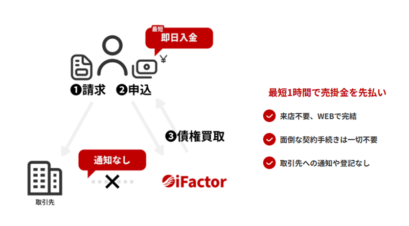 アイファクターのファクタリングは、利用者とアイファクターの2社間のみで契約が完了する「2社間ファクタリング」を採用しています。この方式では、売掛先(取引先)に対する債権譲渡の通知や承諾が不要であり、さらには債権譲渡登記も求められません。