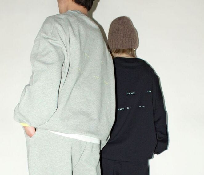 肩部分にワンポイントとしてリブ切り替えを採用した綿のクルーネックスウェットシャツやスウェットパンツも単品、上下どちらでも楽しめる。スウェットシャツは、袖のリブ裏を配色にし、折り返して変化を付けられるほか、背面に同じ配色で同ラインのロゴ刺繍をさりげなくのせる。黒とグレーがあり、どちらも2万円。