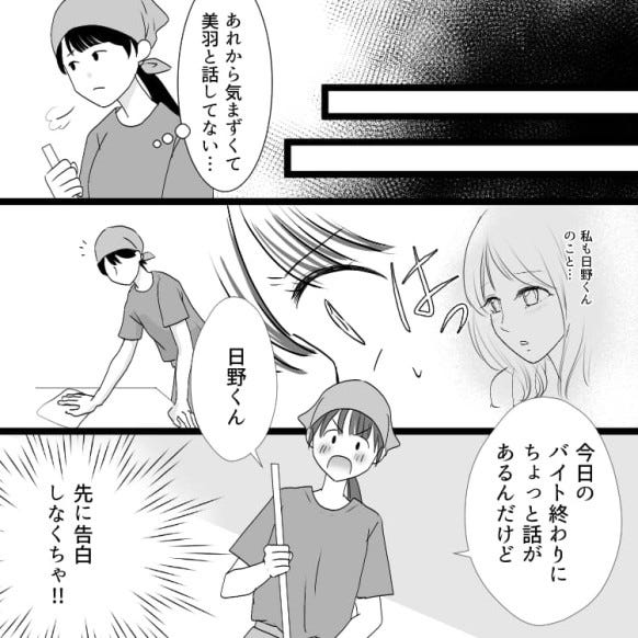 主人公は日頃から恋愛相談をしていた友だち・美羽を誘って食事会に行くことになりますが、彼女も日野くんのことを好きになってしまい…。