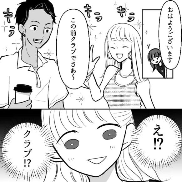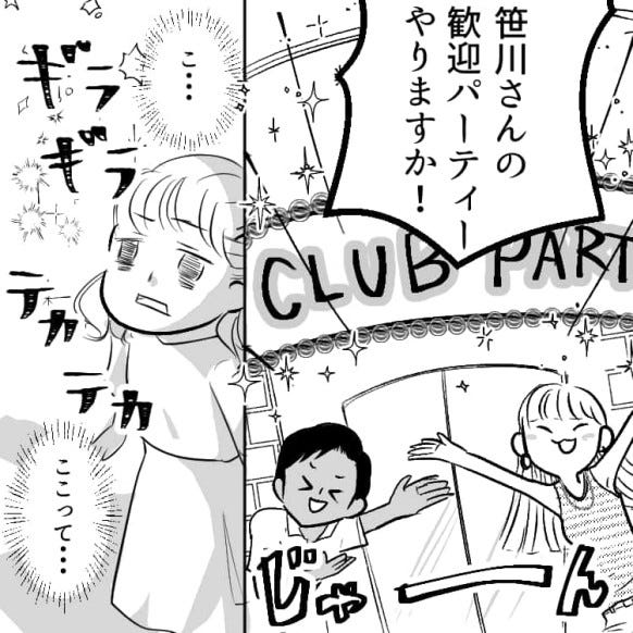 自分の歓迎会がまさかクラブで開かれるとは思わず、驚いた様子の主人公。