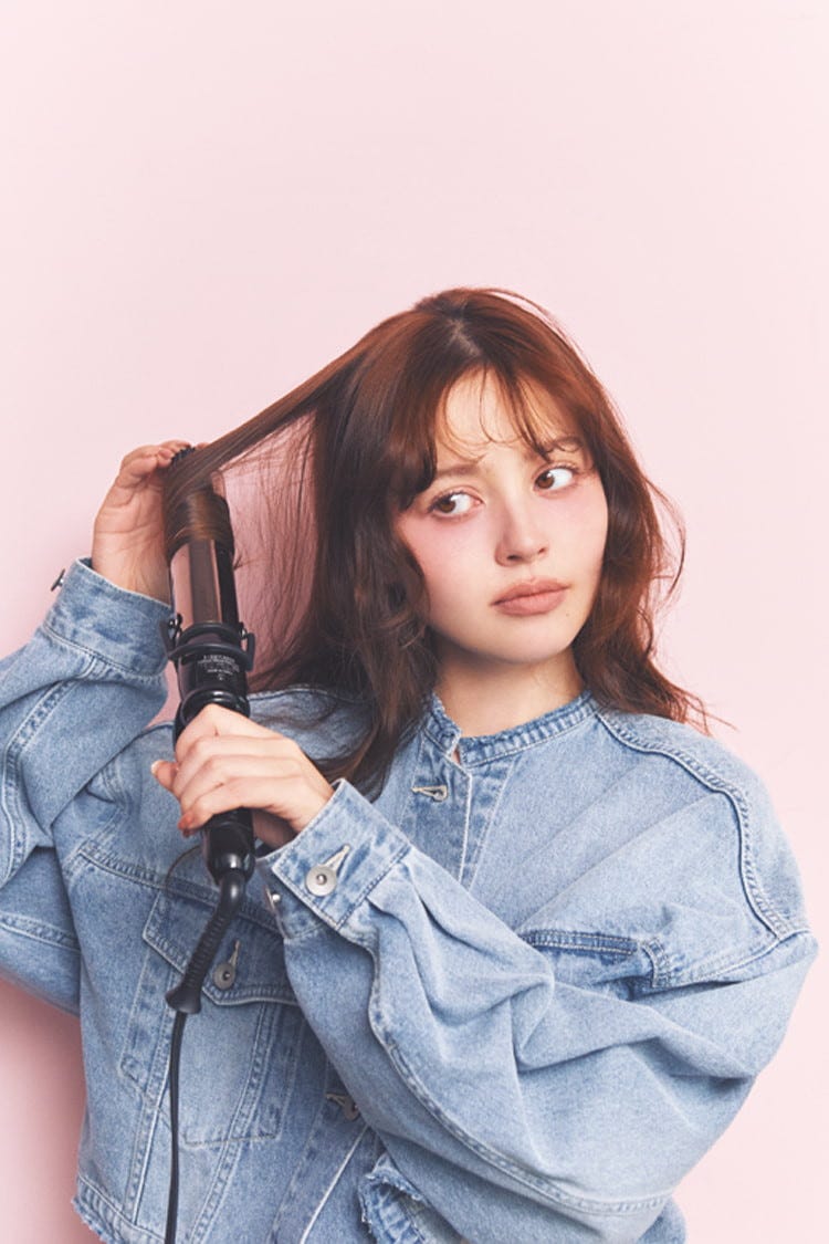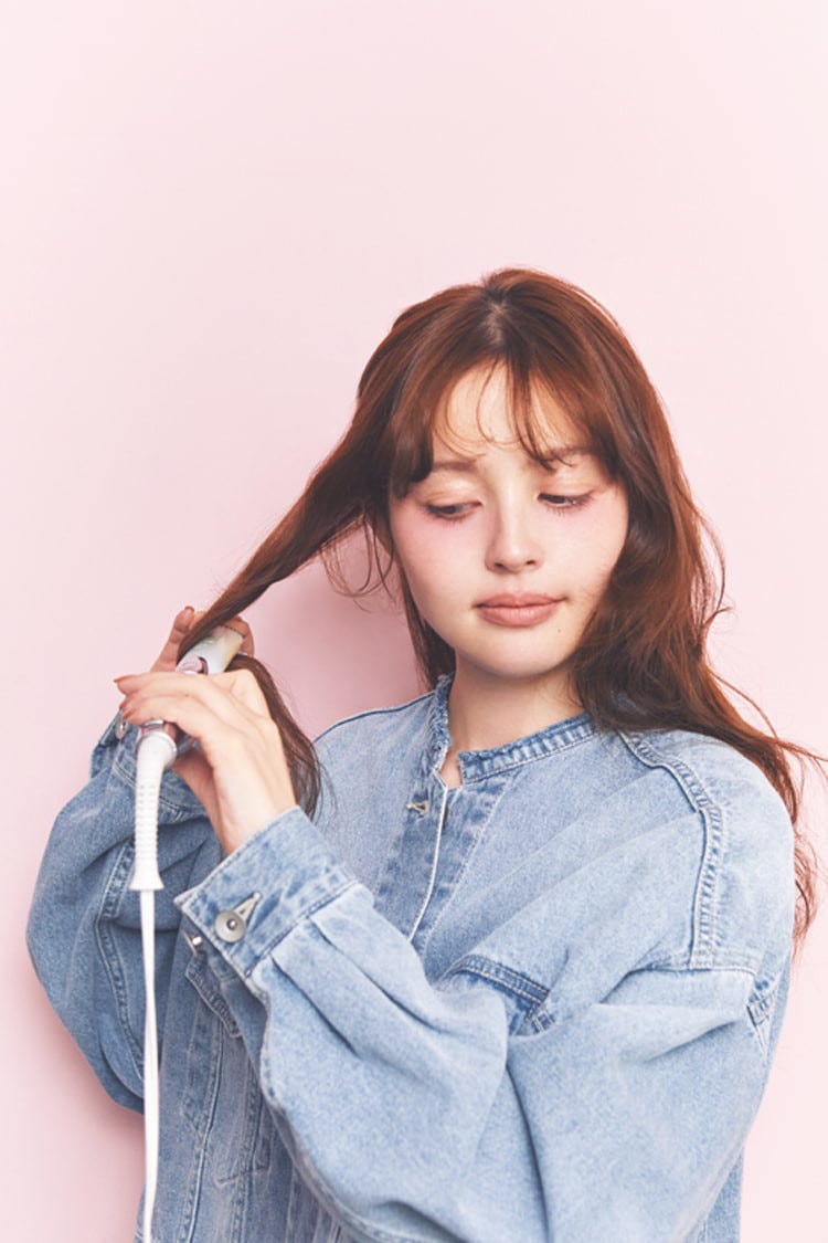 後ろ髪から少量の毛束をつまみ出し、細めのアイロンを使ってしっかりと巻いていく。毛束を取る位置も、内&外の巻く方向もランダムにカールを足して。そのあと手ぐしで全体をほぐす。
