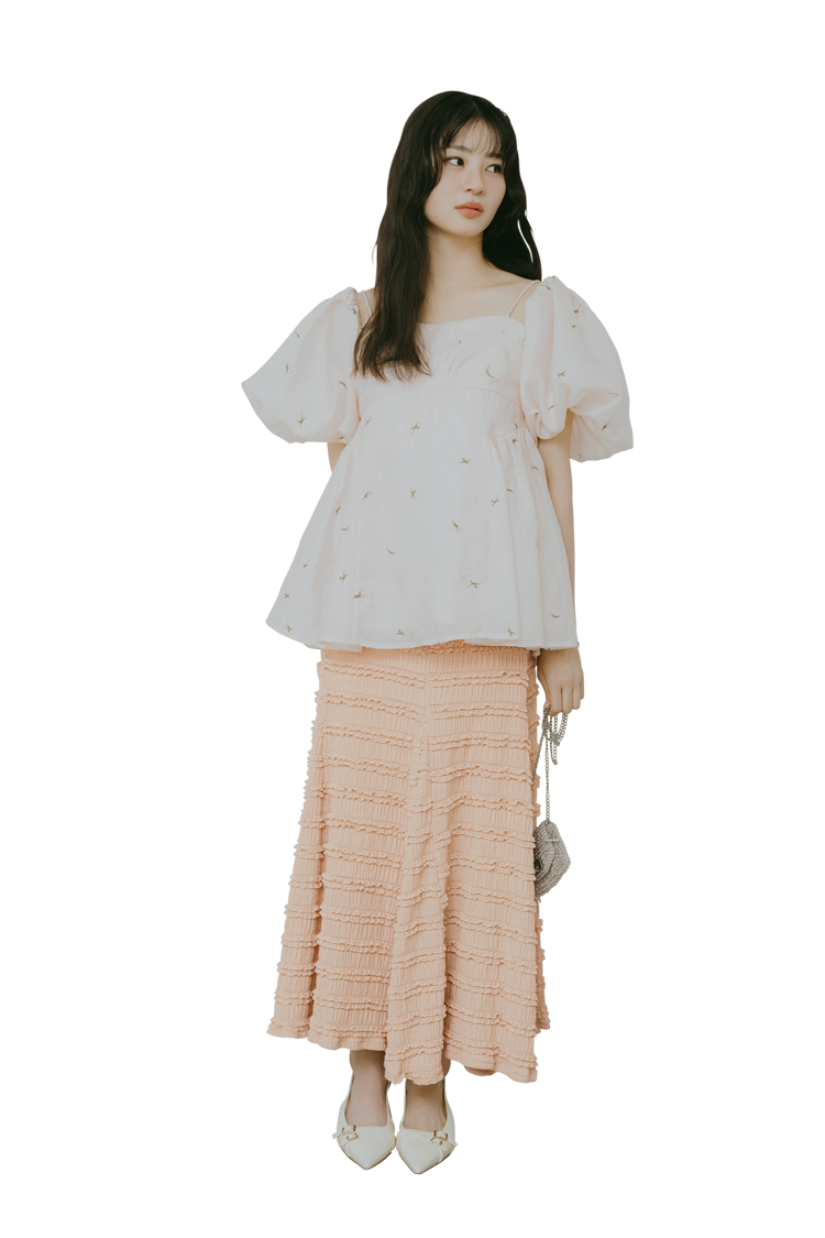 パフスリーブトップスは着回し。スカート(ジップブラウスとスカートのセット)16,940円/REDYAZEL ルミネエスト新宿店 バッグ 35,200円/ANTEP RIMA/WIREBAG(ANTEP RIMA JAPAN)ベルトつきパンプス 14,300円/rienda(バロックジャパンリミテッド)