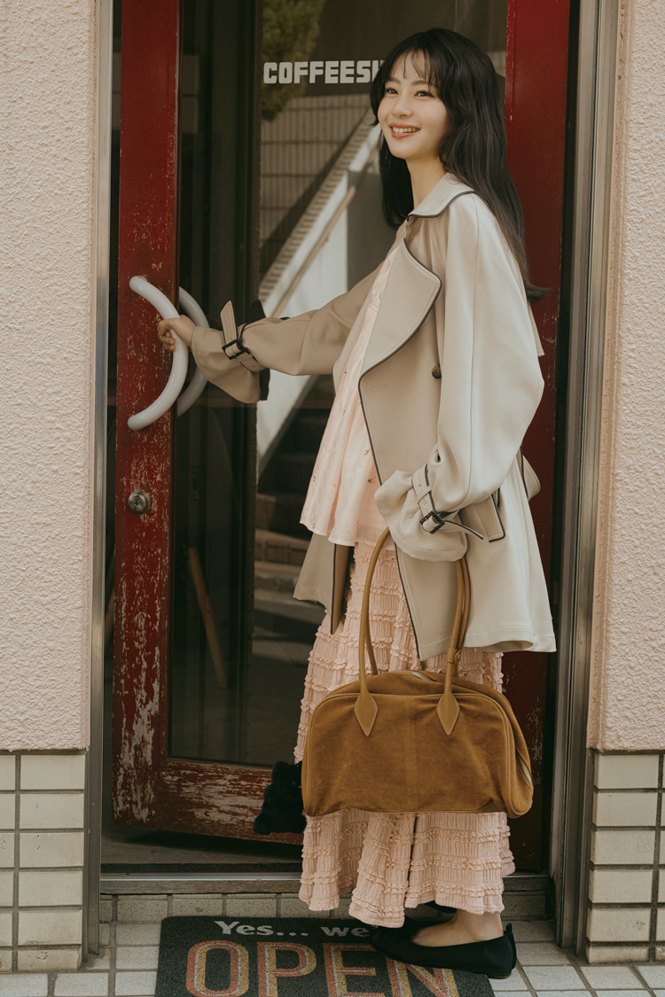 パフスリーブトップスは着回し。トレンチコート 29,700円/リランドチュール スカート(ジップブラウスとスカートのセット)16,940円/REDYAZEL ルミネエスト新宿店 スエードバッグ 3,690円/神戸レタス バレエシューズ 11,900円/NADIA FLORES EN EL CORAZON