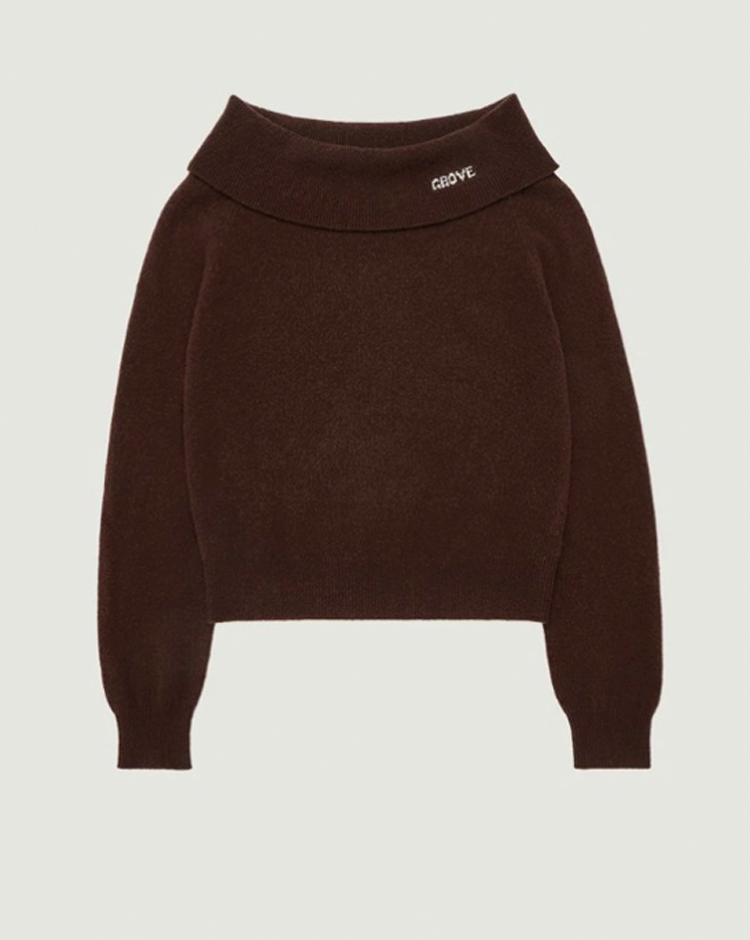 「GROVEのオフショルトップスは、バーガンディとブラウンをMIXしたような絶妙カラーにひと目