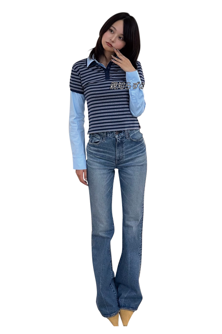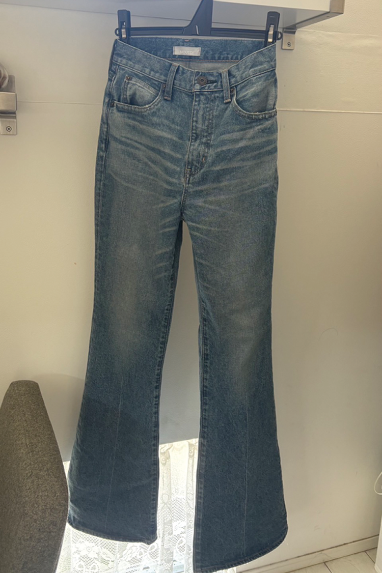 「とにかくスタイルが盛れるMOUSSYのデニム。フレアーなすそからミュールの先をちょこんと出すのが今の気分♡ 理想のシルエットにやっと出会えたって感動した服なので、