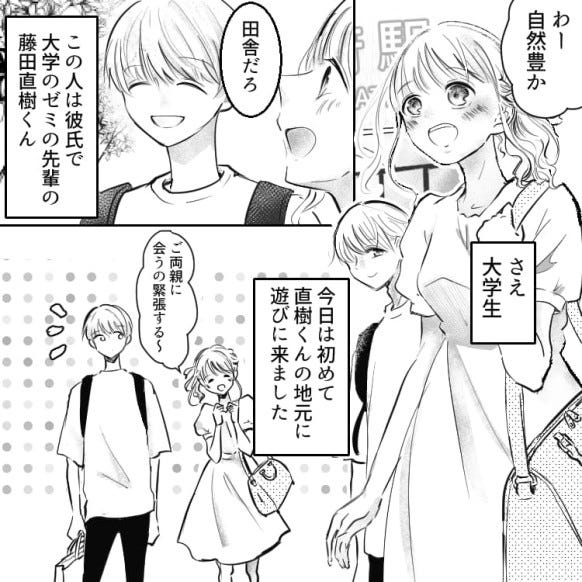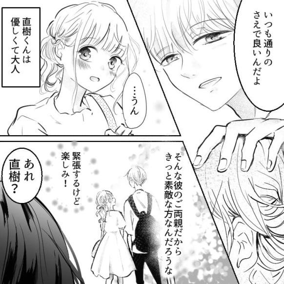 彼氏の直樹くんの実家に行くことになった主人公。初めて直樹くんのご両親に会うので、緊張していました。