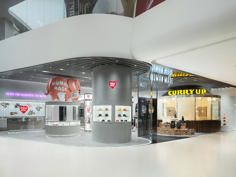 ブランド「ヒューマンメイド」に加え、カレーショップ「カリーアップ」を併設し、ファッションと食を組み合わせた新たな拠点とする。オープン当日は早朝から2000人超が列を作り、タイ市場での高い関心を示した。
