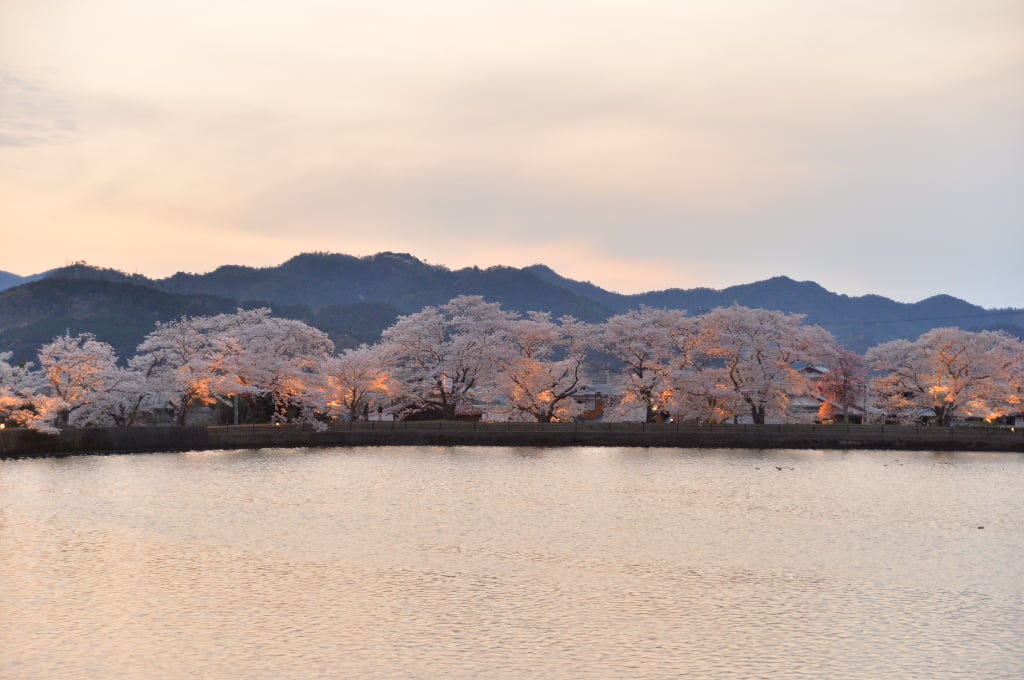 平の沢池のライトアップ 期間中は19:00より、市内各所で夜桜ライトアップが行われます。水面に映る夜桜や、光に照らされた並木道は幻想的な美しさ。昼間とは異なる表情の亀岡の春を堪能できること間違いなしです。