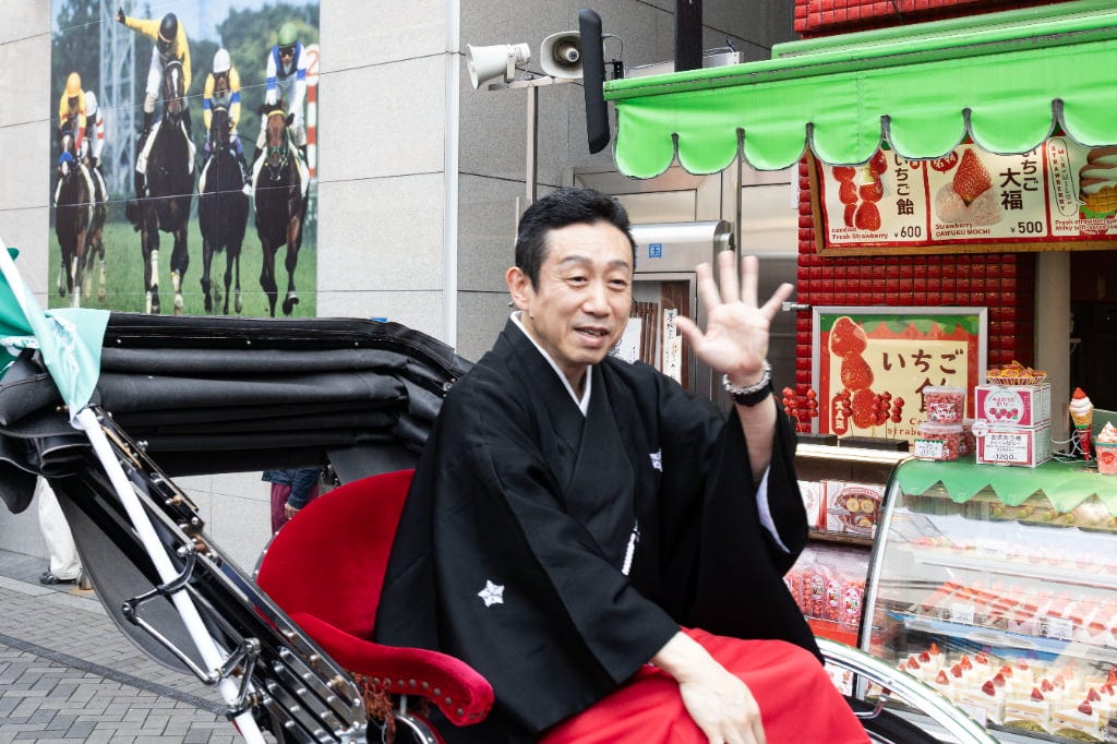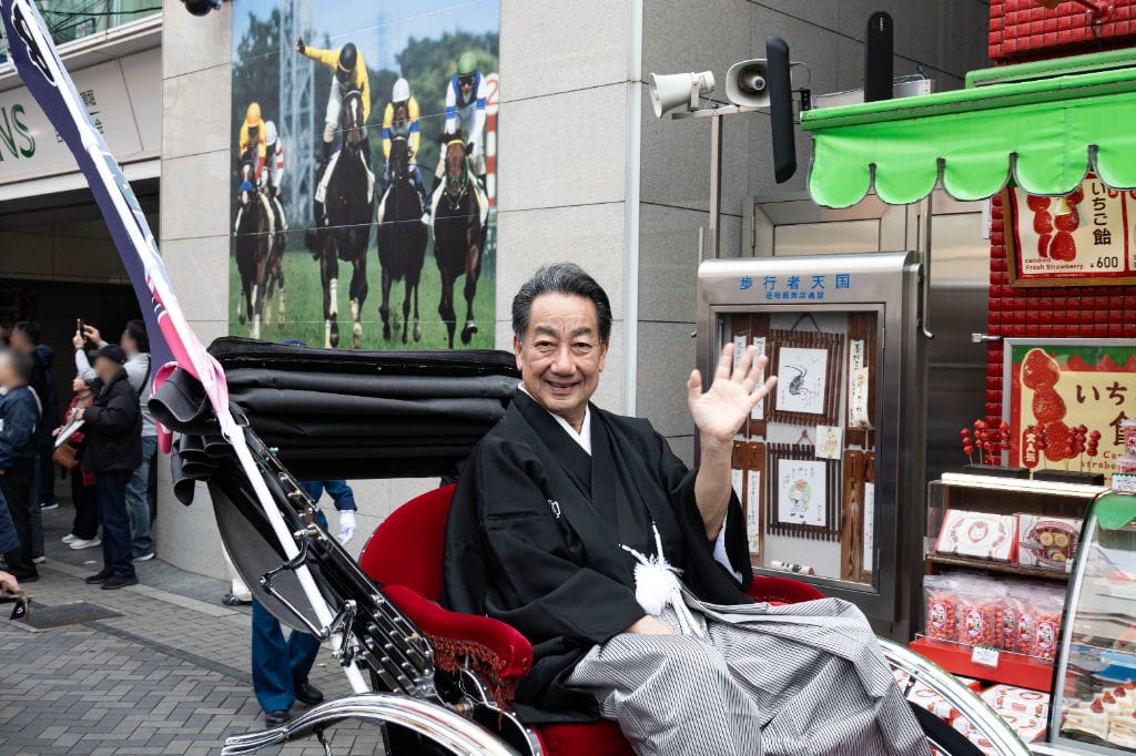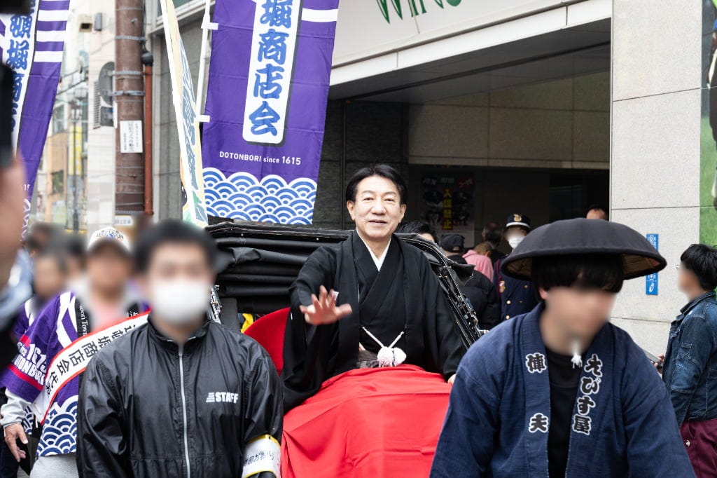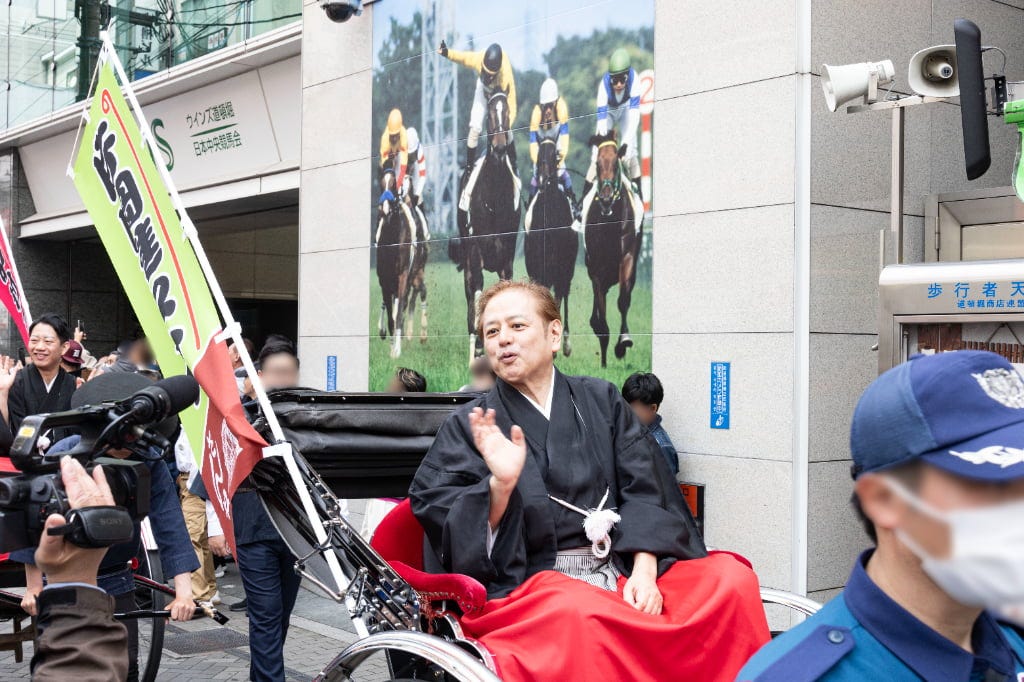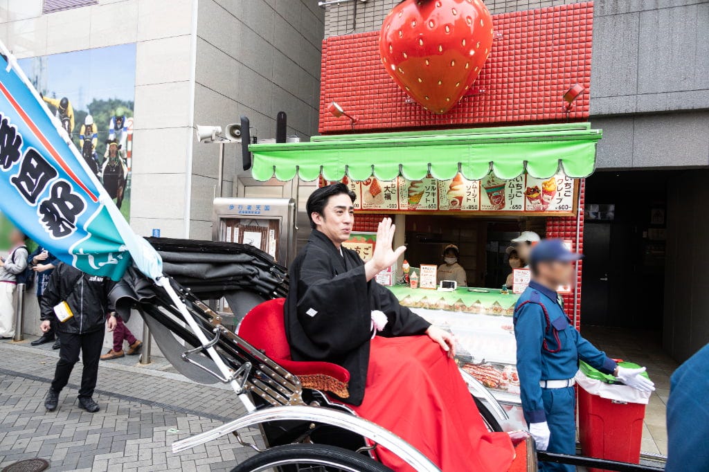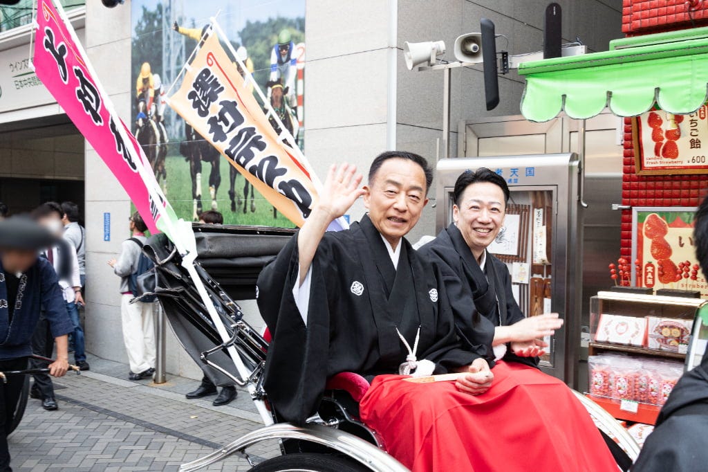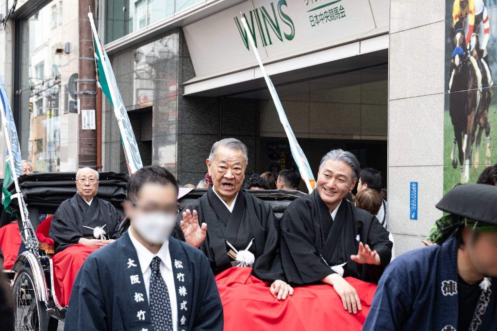 賑わう道頓堀を人力車でお練り! 大阪松竹座前に人気役者が勢ぞろい! 観客といっしょに大阪締めで締めくくり!賑わう道頓堀を人力車でお練り!