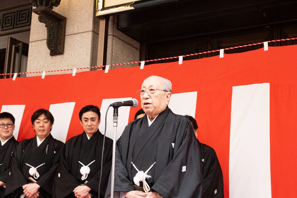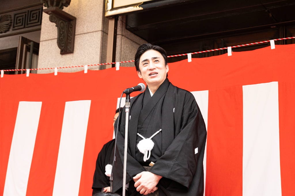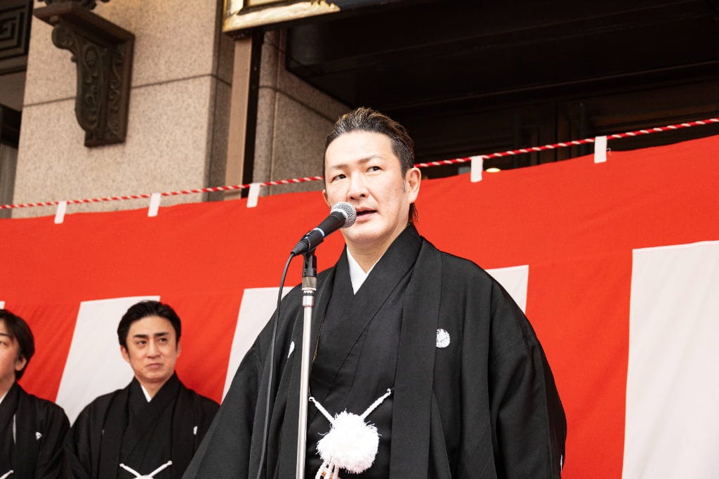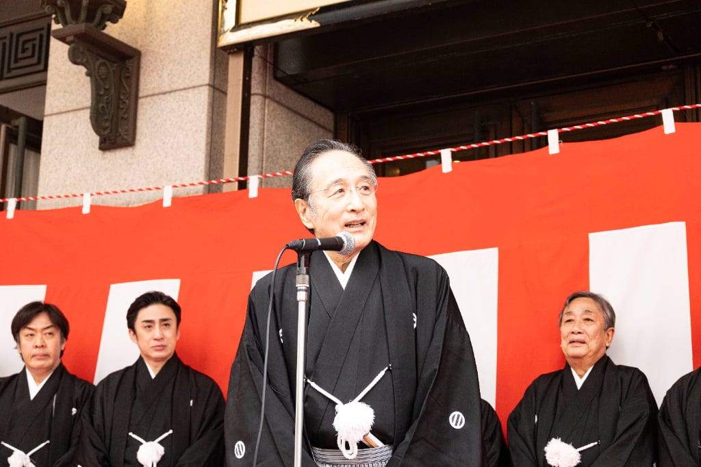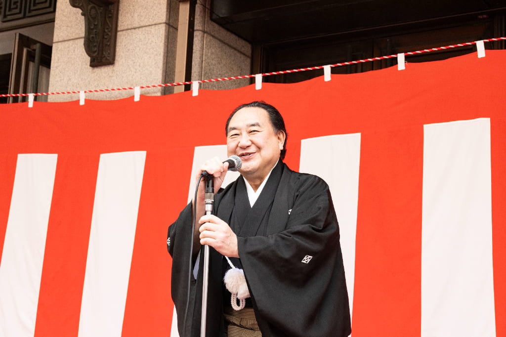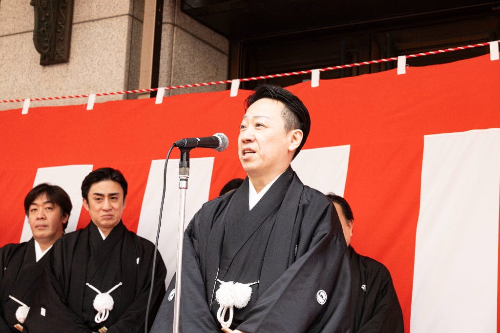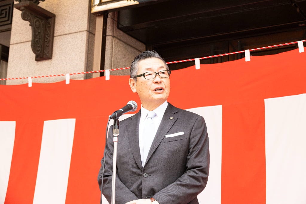 松竹株式会社 代表取締役会長 迫本淳一氏は詰めかけた人たちに御礼を伝えると、大阪松竹座の歴史について振り返り、改めて感謝を伝えます。この5月に一旦大阪松竹座が閉館になることを話し、最後の公演は豪華な顔ぶれであること、そしてこれまでの思い出を心に観劇を楽しんでいただければとアピール。そして、お練りでお客さまからのご声援を肌で感じられたと強調すると、それが心の支え、いい演劇を続けるための心の源泉となると力を込めました。