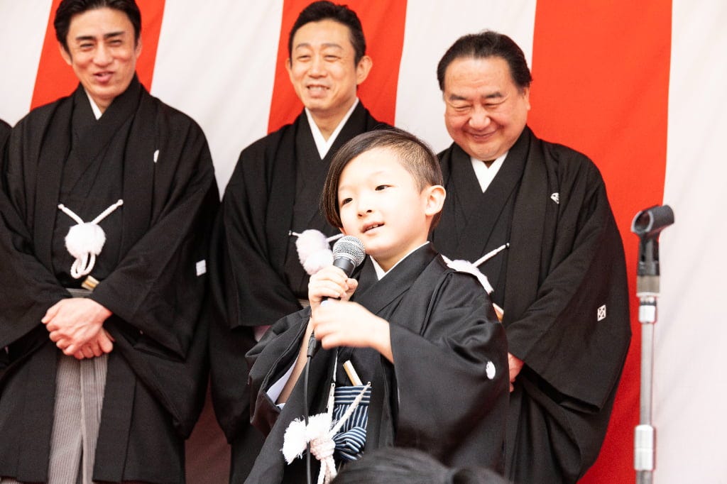 中村陽喜は「松竹座は初めてなので間に合ってうれしいです、ぜひ見に来てください」とかわいく挨拶。観客からは拍手が起こります。中村獅童は次男の夏幹が当面の間休演となったことを詫びつつ、家族でさよなら公演に出演できることを非常にうれしく思っていると力を込めました。