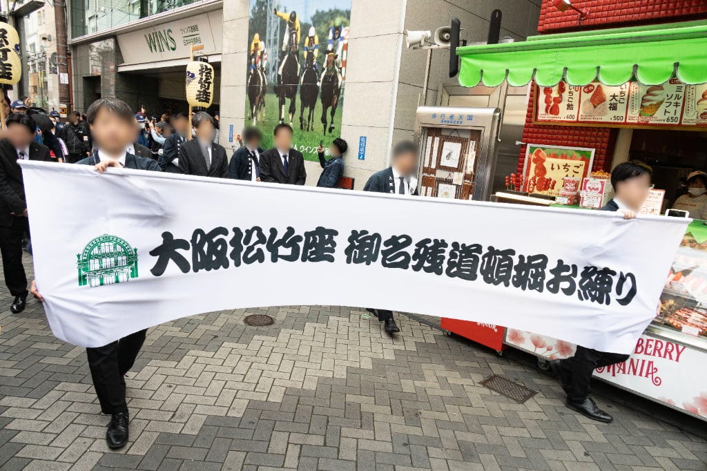 スタッフが持つ「大阪松竹座 御名残道頓堀お練り」の垂れ幕のあとから、お練りが続きます。