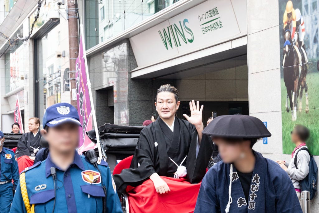 今回のお練りに参加したのは、4月公演に出演する歌舞伎俳優たち。