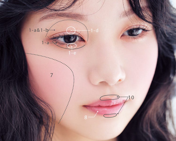 を下まぶた全体に塗る。黒目をはさむように、上まぶたには1-d