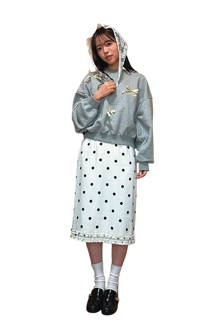 「ドット柄とレースで、ウィッシュコアな雰囲気を演出しました。スエットの