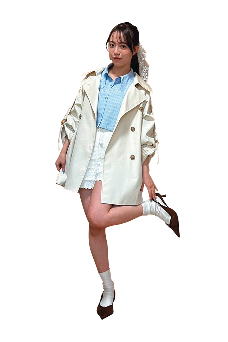 「トレンチコートとシャツでプレッピーなコーデに。春らしいトーンでまとめた分、