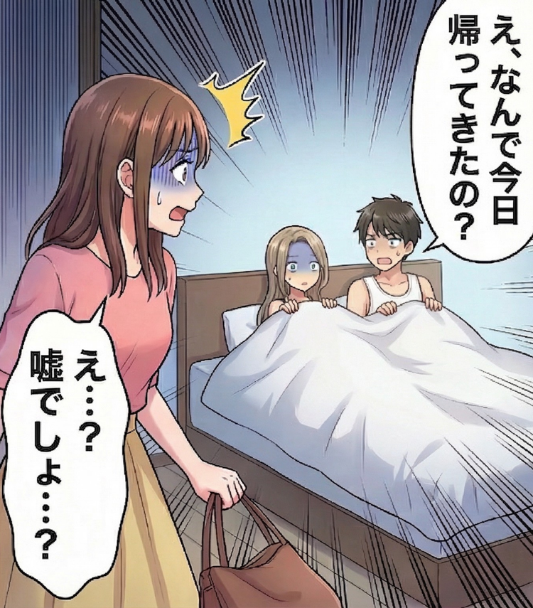 出張中に彼へ留守番を頼んだはずが、帰宅すると【ベッドに見知らぬ女性】といる姿を目撃…!?「なんで帰ってきたの?」と悪びれないひと言に絶句。混乱と怒りがこみ上げた私は“まさかの行動”に…!