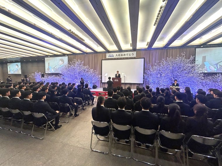 入社式のセレモニーでは、生成AIを活用し、新入社員が10年後、30年後に伊藤忠で活躍する姿や、伊藤忠の近江商人から始まる事業の歩みを〝時空中継〟の動画として映し出した。
