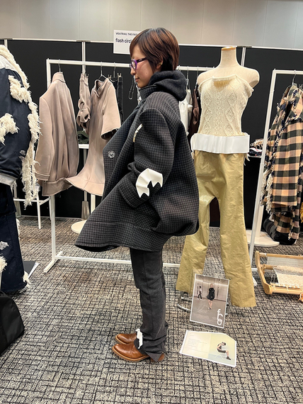 同校から出展した「フラッシュ・サークル・オブ」も、発想を丁寧に形にした。ブランドを手掛けるのは越智暖日さん。コレクションのテーマは「オフィスで働く女性」。通勤電車で見かけた、スーツ姿で窮屈そうに身をかがめる女性に着想を得た。その姿に宿る社会的な圧力や内面の健気さを見つめ、装いとして肯定的に落とし込んだ。