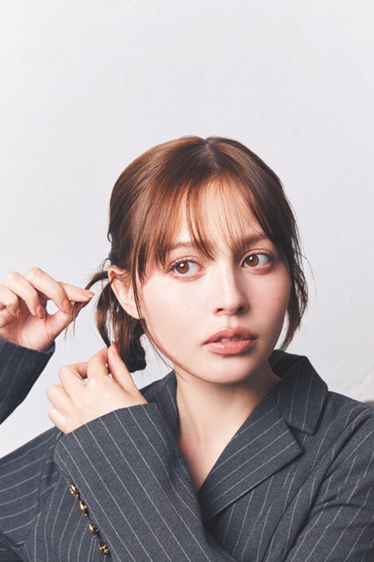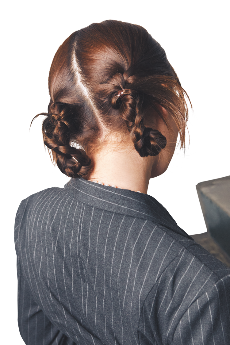 指先にごく少量のバームをなじませ、残した毛先をスタイリング。毛先をさきながら細かい束感を作り、それが放射状に散らばるようにすると、シャープさが出てツインだんごの甘さをセーブできる。