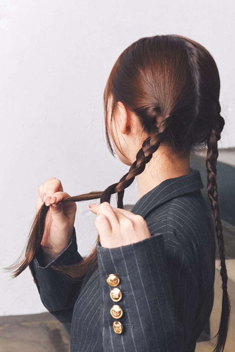 ともすると子どもっぽく見えがちなツインは、ヘアアクセは使わずシンプルに。さらに、タイトに編んだ毛束や、カチモリ風な毛先によってモードさをプラス。