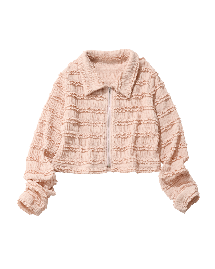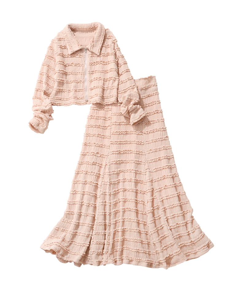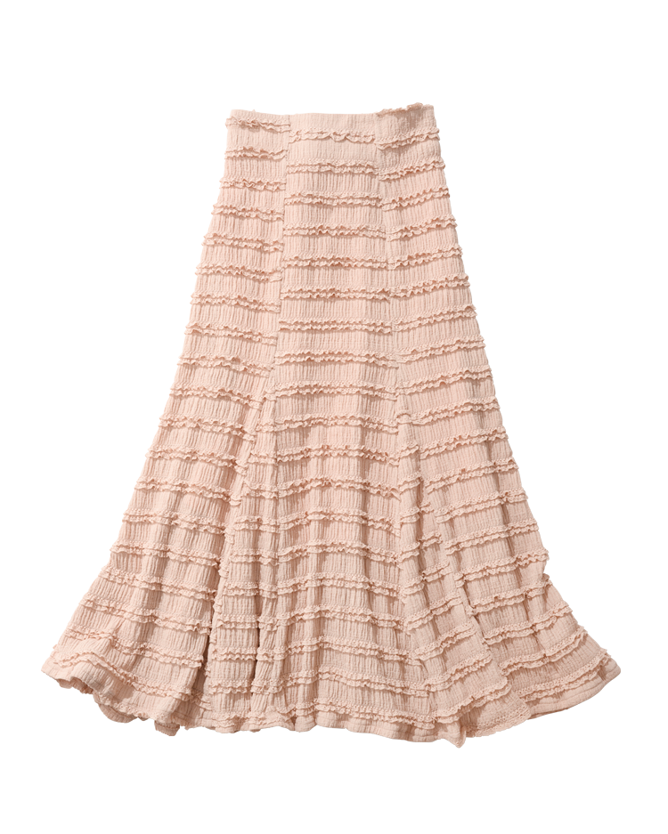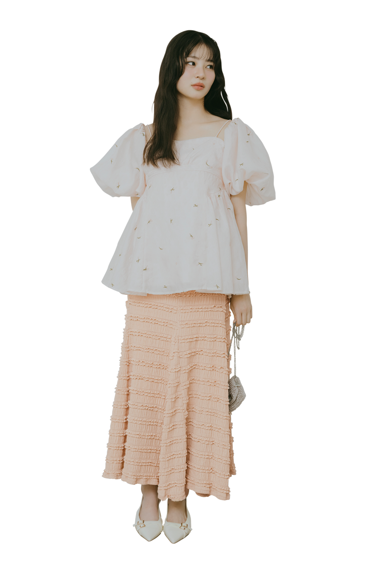 可愛さと品のよさを備えたピンクのセットアップ。全体にあしらわれたフリルが、女性らしさを加速。ガーリーもキレイめも◎。