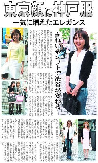 関西で一大ブームになって2年。東京でじわじわ繁殖していた神戸エレガンスが、ストリートの主役になりそうだ。OLだけでなく高校生にまで広がっている。すっきり可愛い東京メイクやキラキラシャドーのギャル系メイクに、襟を立てたシャツやパイピングニットの組み合わせが何とも微妙な雰囲気。つい最近まで「着たことなかった」という〝新規参入者〟がほとんどだ。