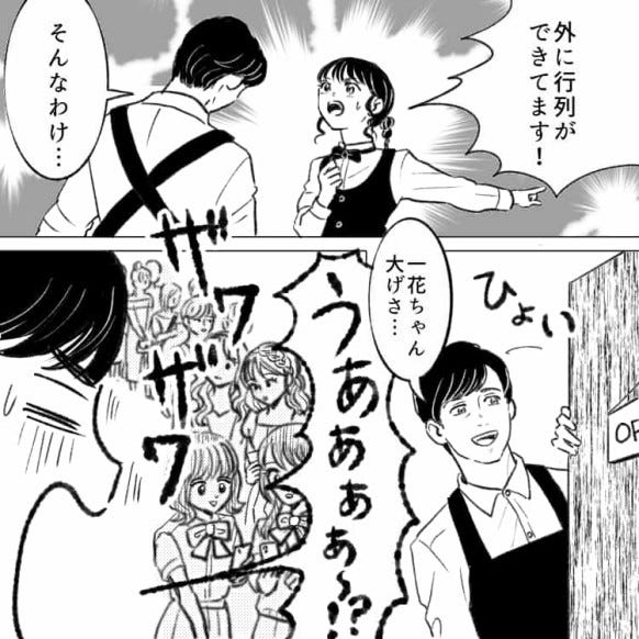 外に行列ができ、驚く主人公と店長。