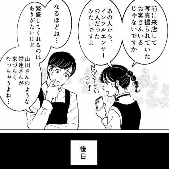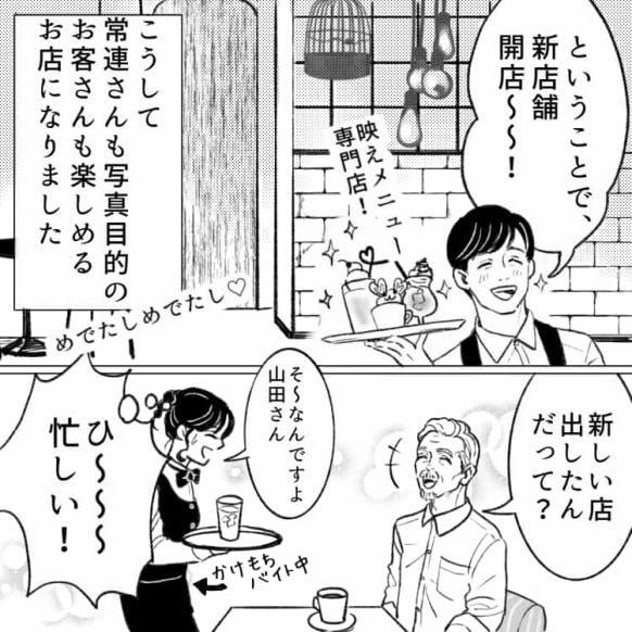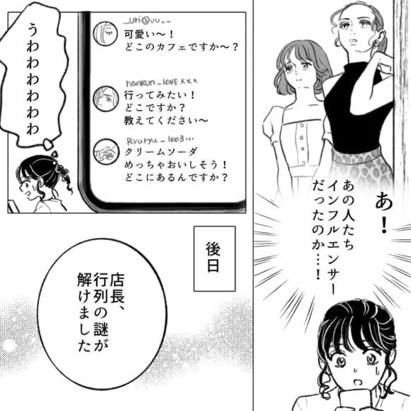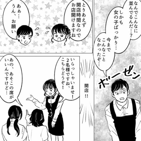 後日お店の前に行列ができ、驚く主人公と店長。