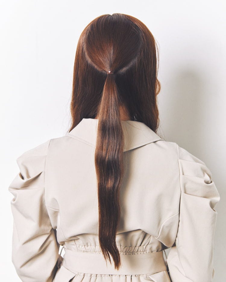 両サイドの耳上の髪を残した状態で、ハーフアップにする。このとき、ハチから後頭部の中心に向かってU字を描くように髪をとりわける。毛束は結び目を寝かせるように細ゴムで結んでおく。