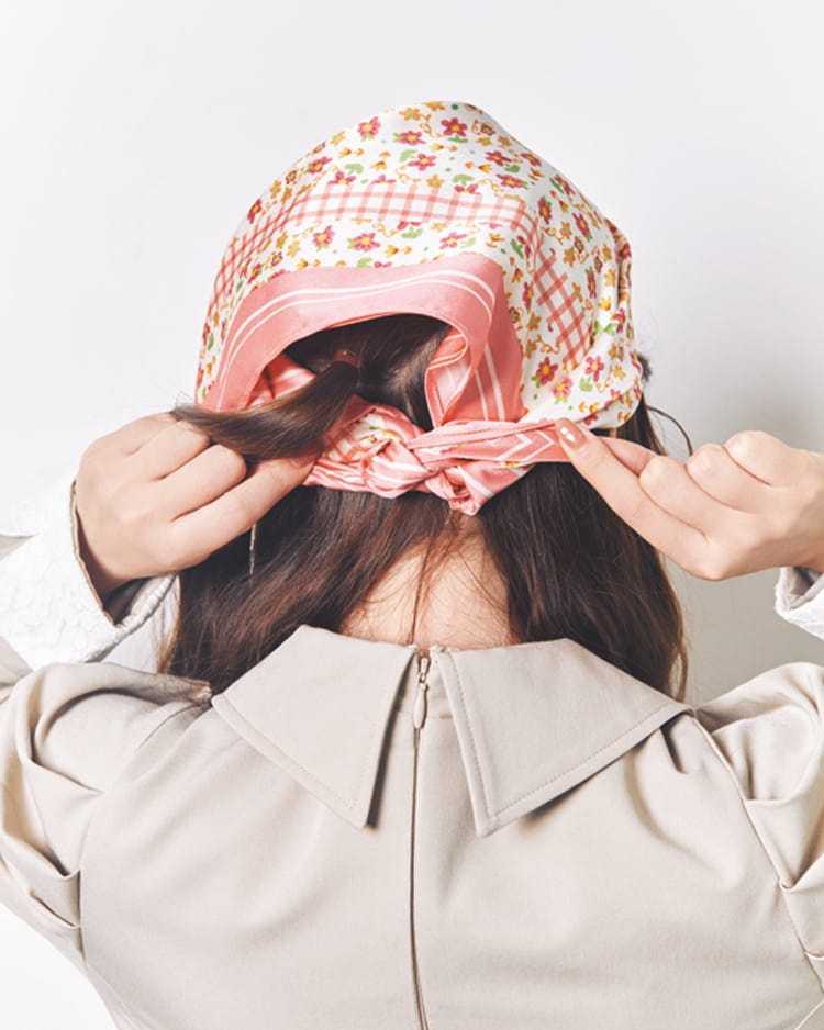半分に折って三角形にしたスカーフを頭に巻く。このとき、スカーフの両端を