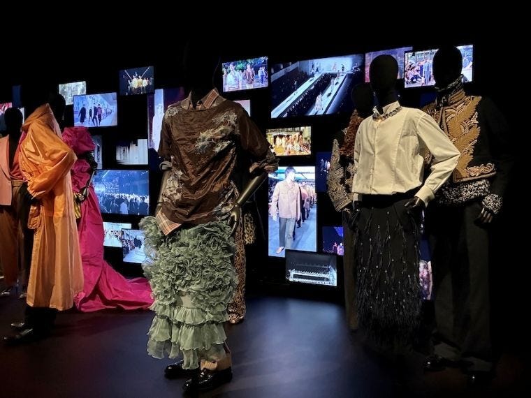 ドリス・ヴァン・ノッテンはとても饒舌な空間。オリエンタルやテーラード、カラフルでありながらも落ち着いた色使いなど、彼らしい作品が展示とたくさんの映像で紹介されている。